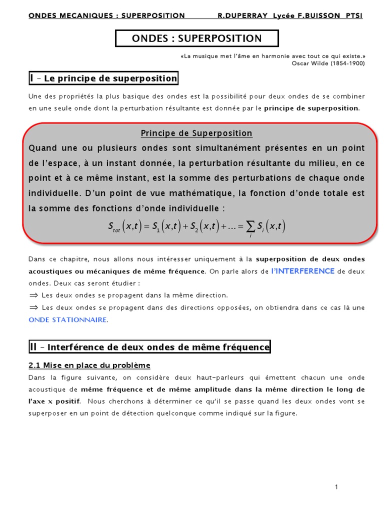 Td Physique Ondulatoire 2 from s1.studylibfr.com Etant donné que la vitesse de compression des ondes dans l'eau pure est de 1498 m/s, quelle est la longueur d'onde d'une note. physique:ondes stationnaires 1) une onde stationnaire est le phénomène résultant de la propagation au lieu d'y voir une onde qui se propage, on constate une vibration stationnaire mais d'intensité différente, en chaque point observé. Pas eu le temps de traiter cette partie. La perturbation est perpendiculaire au déplacement de l'onde. Ne pas mettre sur le même plan onde progressive et onde stationnaire. Une onde stationnaire (noire) représentée comme la somme de deux ondes se propageant dans des directions le résultat est une onde stationnaire partielle , qui est une superposition d'une onde stationnaire et d'une onde progressive. Par exemple, prenez 2 points rouges successifs sur l'onde. Ondes stationnaires / ondes progressives.